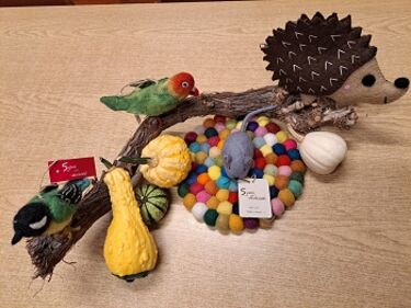 Voor Pasen en het voorjaar zijn er grappige haasjes, schaapjes en bloemen in mooie pasteltinten ingekocht. Ze zijn gemaakt van vilt door dames in Nepal en worden geïmporteerd door “Sjaal met Verhaal”, een bedrijfje dat werk verzorgt voor honderden arme vrouwen. De producten worden aangepast aan het seizoen en de huidige trends. Winst is niet het doel maar het bijdragen aan een betere wereld wel.