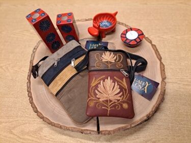 Schapenleren tasjes van Happy Lona uit Kasjmir. Een vrolijke collectie kleine tasjes ideaal voor op reis of op een festival.