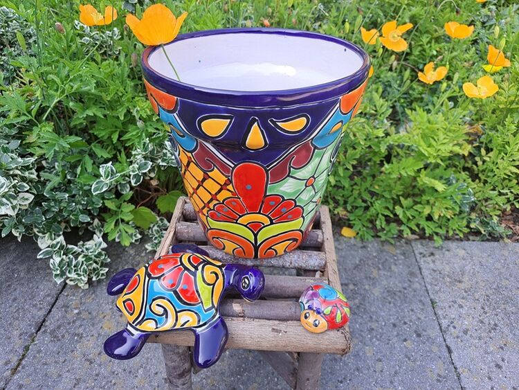 Fraaie, met de hand beschilderde bloempotten en decoratieve objecten uit Mexico. Gemaakt volgens een 500 jaar oude Mexicaanse traditie. De vrouwen beschilderen het met een eigen ontwerp waardoor geen schaal of pot hetzelfde is. Het basismateriaal bestaat uit klei, lokaal gevonden, die verwerkt wordt in mallen. Gebakken in de oven op 1200 graden, de glazuurlaag zorgt ervoor dat het keramiek waterbestendig is. Geschikt voor zowel binnen als buiten, alleen bij vorst naar binnen.